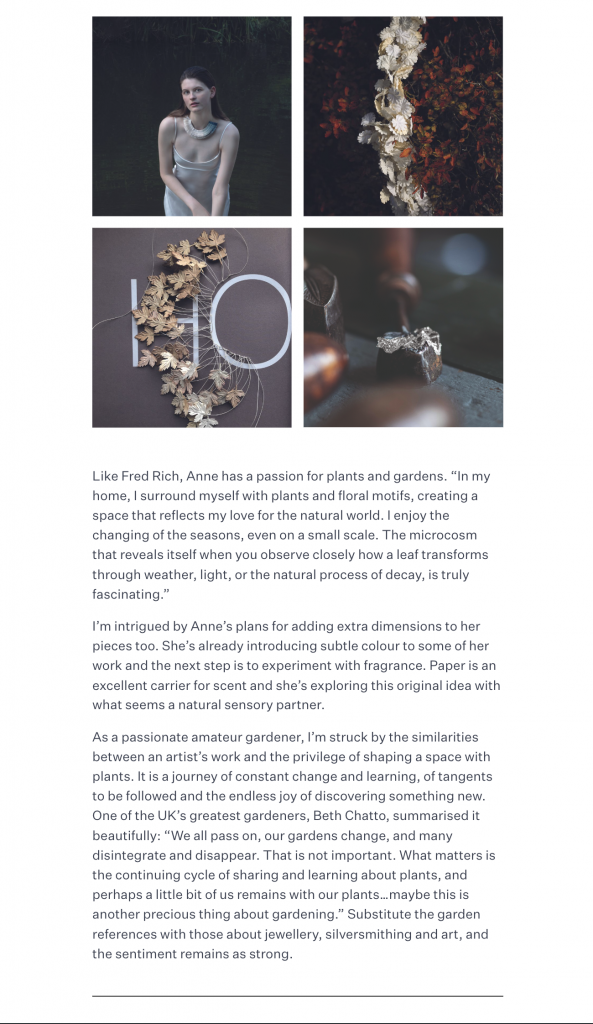 Like Fred Rich, Anne has a passion for plants and gardens. “In my home, I surround myself with plants and floral motifs, creating a space that reflects my love for the natural world. I enjoy the changing of the seasons, even on a small scale. The microcosm that reveals itself when you observe closely how a leaf transforms through weather, light, or the natural process of decay, is truly fascinating.”